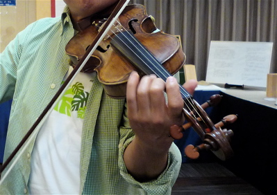 一番小さいときからの友達、かっちゃんの兄さん。 小さい時は一緒にあそんでもらった。 田んぼでの野球とか、カンケリ、ビー玉。 2歳年上なので、その当時はずいぶんお兄さんに見えた。 簡易保険の仕事で成績もダントツだった。 保険のポスターになったこともある。 子供たちの学資保険でも、とても助かった。 当時は利率も高かったし 満期を迎えた時にはビックリするくらいの額だった。 働き盛りの時に発病され 10年近く闘病されていた。 たまたまフィドルの生徒さんが 同僚だったと聞き、エ〜ッと思ったこともある。 つらかったろうね、よっしゃん。 もうがんばらなくても良くなったね、よっしゃん。 ご冥福をお祈りします、合掌。 ゴルフスイングは悩みがおおい。 変な方向にいくとどツボにはまる。 ヘタを固めると良く言われる。 変な打ち方をしているとどんどんヘタになっていく。 それがくやしくてまた何百球も打つのだが 打てば打つだけ下手になっていく。 それが何かヒョンなきっかけで いいショットになることがある。 それを開眼する と勝手に言っているのだが 長い間やっていると何度も開眼する。 おー、やったーっ。とそのときは思う。 けれどすぐにそれを忘れてしまうことも多い。 始めた瞬間からレッスンを受けた方がいい。 絶対プロに習うべきだ、となりのオッサンでは駄目。 ゴルフは教えたがりがおおく、 人のスイングを見てはあれこれ口出しする。 ビギナーのころはなってないとこが多いから 介入を受けやすい。 その生兵法のもとで 下手になっていく。サイアク。 丸山茂樹選手のスイング。 今年はこのビデオよりもっとクラブが長く出ている(気がする) きのう、打ちっぱなしでクラブを低く長く出す練習をした。 するとショットが俄然よくなり開眼した という話でした。 去年は毎日、2〜3本のキューリが食べれた。 今年も、育ってきている。 3本の苗を買って植えていたが1本が玉砕。 残る2本がたより。 何に限らず成長を見るのは楽しい。 植物でも楽器でも人間でも。 アサガオとゴーヤの緑のカーテンが 去年は日差しを遮ってくれ、心地よい緑がガラス越しに楽しめた。 ことしはゴーヤのみにしている。 ゴーヤのつるを横にのばして出窓にカーテンを作る。 ゴーヤは去年の種をまいた。 だめかな?と思っていたが3ケ所芽を出してくれた。 キューリは浅漬けやポテトサラダに。 いためてもおいしい。昆布和えもいい。 ゴーヤは穫れすぎるとやや食傷気味になるが おひたし、チャンプルー。 熟れて黄色くなってくると ゴーヤジュースがうまい。 熟れたゴーヤは最初こそキモかったが ジュースにすると そんなこと思ってごめんね、といいたくなる。 旧姓が岸上だったので キシミちゃんと呼んでいた。 大学時代の友達だが そのときすでにバンジョーでフレイリングをやっていた。 彼女の大学のアメ民は多彩なひとが多く、 半分あこがれの目でみていたなぁ。 中野ジンタさん、ポップアイド、安藤君や谷村君 独特の音楽感と表現力。 ジンタさんは中野ジンタみつしげという本名? サードネームまであるめずらしいヒト。 フィドルもうまかったが、ペダルスチールも メチャクチャうまかった。 そういうなかでキシミちゃんと知り合った。 ギブソンのRB-100での演奏はとてもホンワカしていた。 一時、一緒にバンドをやったことがある。 亡くなった名フィドラー平地さん、キシミちゃん、僕。 Izumi,SweetGrassという全曲日本語の CDも出している。 昔のままの姿でまったく変わっていない。 あいかわらず若いなぁと思う。 尊敬する人の一人です。 サイトは http://www.izumi-sweetgrass.com/ チグリス、ユーフラテス川。 メソポタミア文明の発祥の地。 米所並大迷亜 が漢字での当て字。 複数の川の間 という意味らしい。 少し前はペルシャ、現在はイラクという国が そこにある。 チグリス川、ユーフラテス川にはさまれた肥沃な土地は シュメール、バビロン、アッシリア、ヒッタイト、エジプト文明などが栄えたとある。 シュメール人は楔形文字を初めて使い始めたし ヒッタイトは鉄を初めて使っていた人たち。 むか〜し習ったんですよね。 ほとんど忘れていた。 だいたい3大文明か4代文明かも忘れているし。 エジプト、インダス、黄河だったかな? チグリスユーフラテスなんて 普段は言わないし頭の隅にもない名前。 ただ中学校に入って、歴史の授業で 最初くらいに出て来るので、知名度は高い? バックインビジネスというのが、バンドの名前だが 東京支店長不在のときは、チグリスユーフラテスでいこうかな? 午前から午後にかけてバイオリンの練習。 和室を工事している途中だが音の響きがキモチよい。 それで時間を忘れて弾いてしまう。 バッハ、ヘンデル中心に弾く。 午後はフィドル、 ハイランドホーンパイプやキャトルインザケインなど。 やったことのない曲を初見で弾いていく。 しばらくすると忘れるけど。 そういえば先日モーツアルトのフルート四重奏を聴いていて リズ